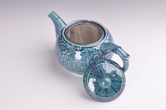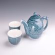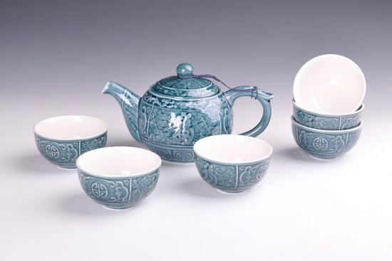【品名】青蓝釉浮雕福大圆壶大新茶杯 8头茶具组